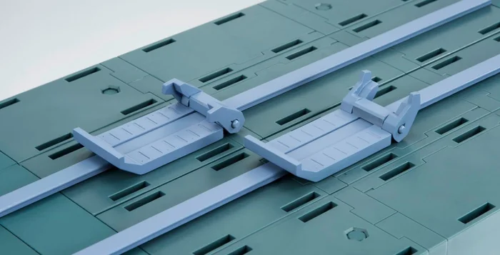 It also includes gimmicks from the anime, such as moving the catapult along the rail, shuttle lock mechanism, and adjusting the height of the blast deflector. Unused props can be stored inside the blast deflector, too~