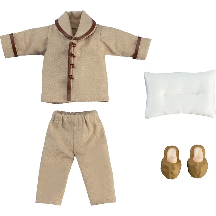 Introducing a Nendoroid Doll pajama outfit set! From Good Smile Company and designed by Kazumi Oka, the set features a real fabric outfit in either navy or beige that includes a pajama top and bottoms along with a pillow and fluffy looking slippers.