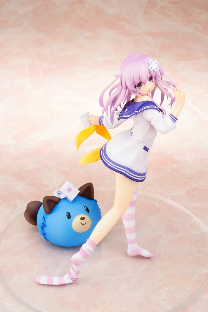 Don’t worry, you aren’t dreaming. Wipe the drowsiness out of your eyes, because this cute 1/8 scale figure of Nepgear from Hyperdimension Neptunia really exists! “Neppy Jr.” is 8.3″ tall and seems to be getting ready in a tizzy, probably from waking up a bit late! She has a sleepy look to her eyes, holding a toothbrush up to her mouth in one hand, and a rinsing cup in the other. One of Nepgear’s socks isn’t completely pulled up, and her human form sailor-style outfit isn’t even buttoned yet! Oh my! But don’t worry, an adorable blue Dogoo is there to help her start her day, as you can see from the pouch it’s carrying with its head!