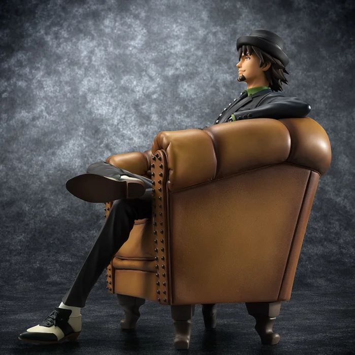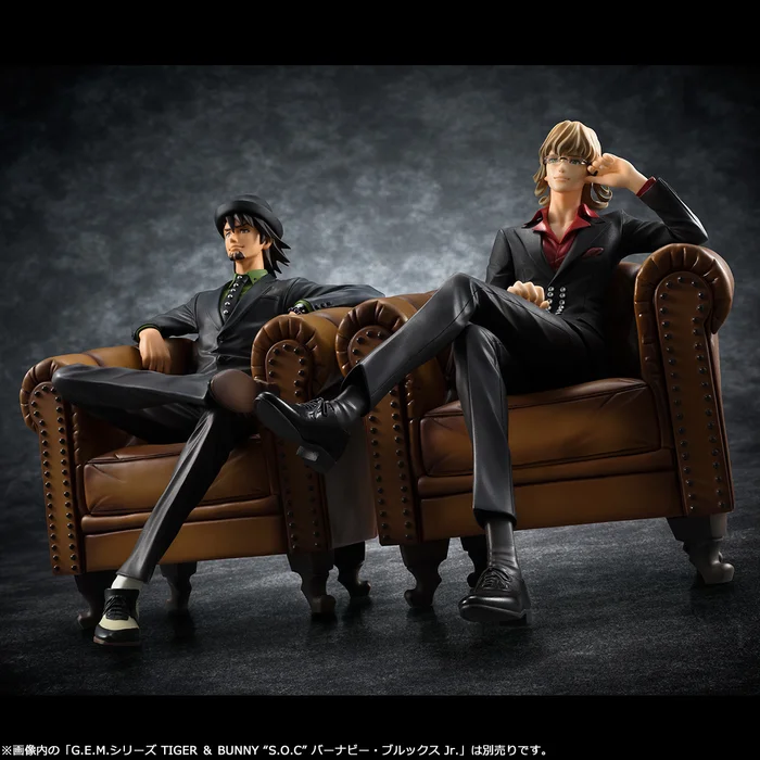 Wild Tiger himself, Kotetsu T. Kaburagi, is taking a break from his hero duties for the G.E.M. S.O.C. (sit on a chair) series from MegaHouse. Sitting 5.9” tall, he’s sculpted leaning back on a regal dark tan studded armchair with one leg over the other wearing a dark suit, hat, and two-tone Oxford shoes sporting a studded tie and a confident grin. Detailed even down to his wedding ring and mala bracelet, don’t miss your chance to add Kotetsu’s cool, classy air to your collection. And consider pairing him with
