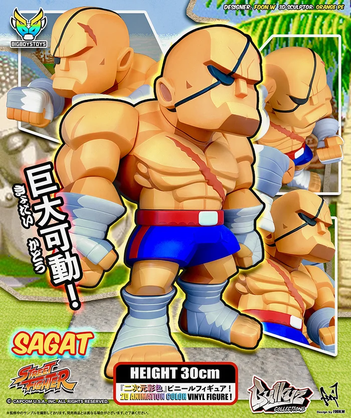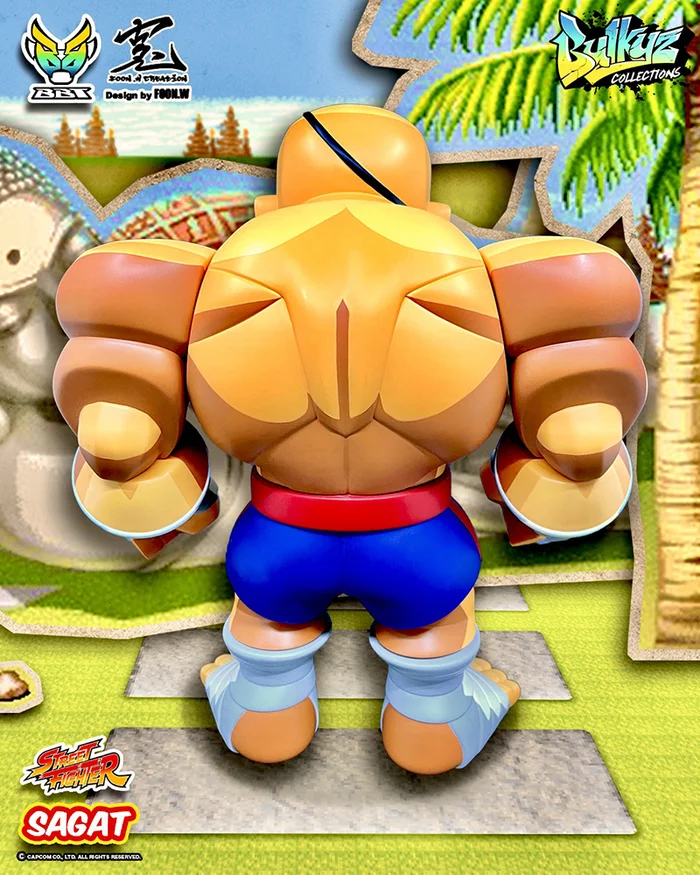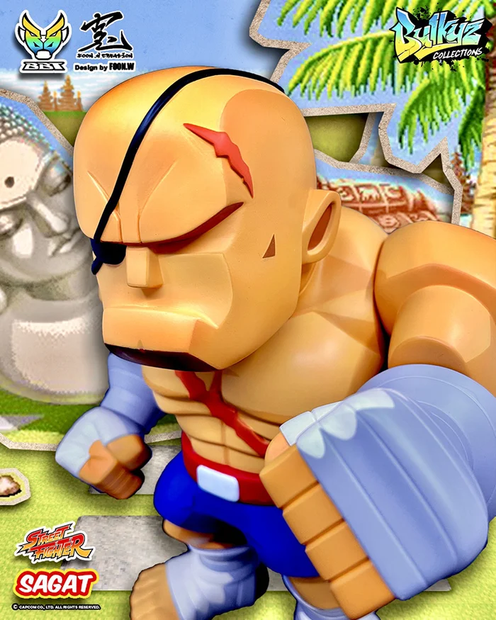 Thailand’s fierce one-eyed challenger takes on Big Boy Toy’s Bulkyz Collections line! Introducing Sagat from the Street Fighter series! Sagat measures a whopping 11.8″ tall! Sculpted in large SD proportions, you can easily view his bulging muscles and scars! The figure features 10 points of articulation, 2D coloring and shading, and the Bulkyz artistic style! All in all, this vinyl collector’s piece is a total knockout!